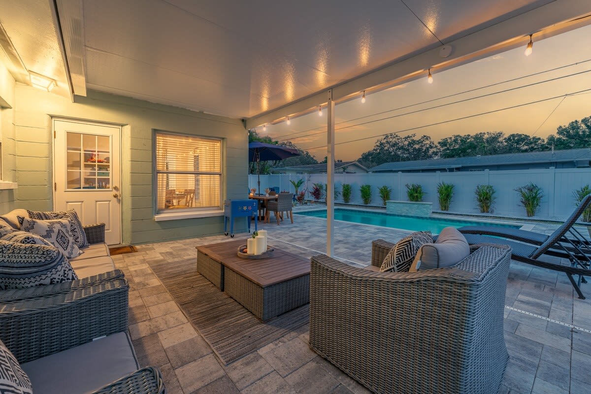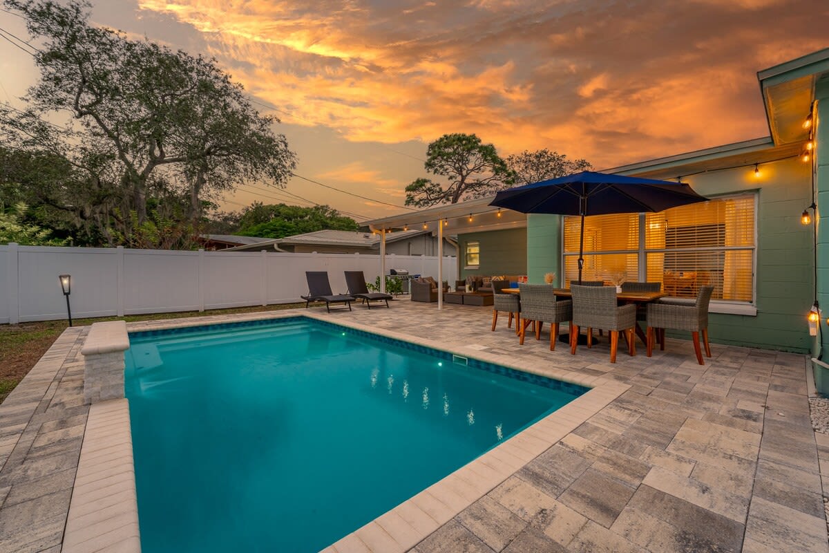 October Special: Book 5+ nights & get 1 free! Message us for more info. Discover Aqua Sunscape, where every corner invites you to unwind. Spend sunny afternoons by the heated pool, grill on the Blackstone, and gather at night around the fire pit. The fenced yard is ideal for kids and dogs, while the string-lit patio sets the mood for unforgettable evenings. Just minutes from Clearwater & Indian Rocks Beach, your Florida oasis awaits.