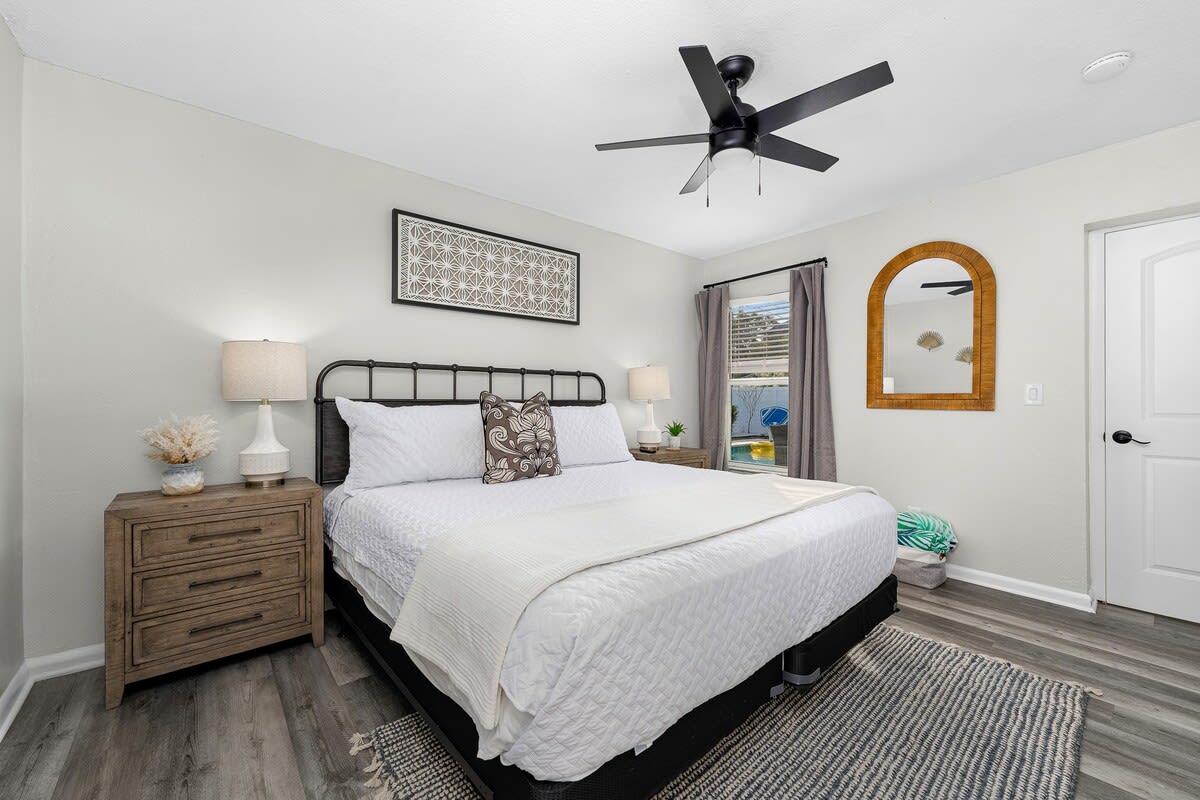 The backyard is where this home shines. Swim in the heated pool, relax on the covered patio, or share stories around the fire pit. Grill meals on the Blackstone, enjoy dinner outdoors, or let the kids and dogs play in the fenced yard. At night, the patio comes alive under string lights, creating the perfect atmosphere for unwinding after a beach day.