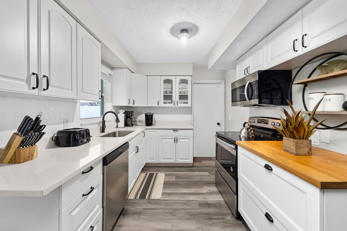 The fully equipped kitchen has everything you need for cooking at home, cookware, utensils, appliances, and more. The open layout gives everyone room to gather while still having space to spread out. Whether it’s family dinners, work-from-home days, or movie nights, you’ll find the house stocked and ready with supplies.