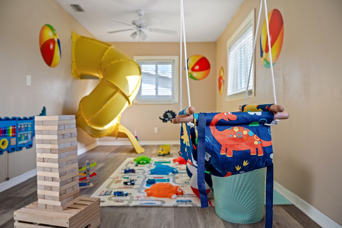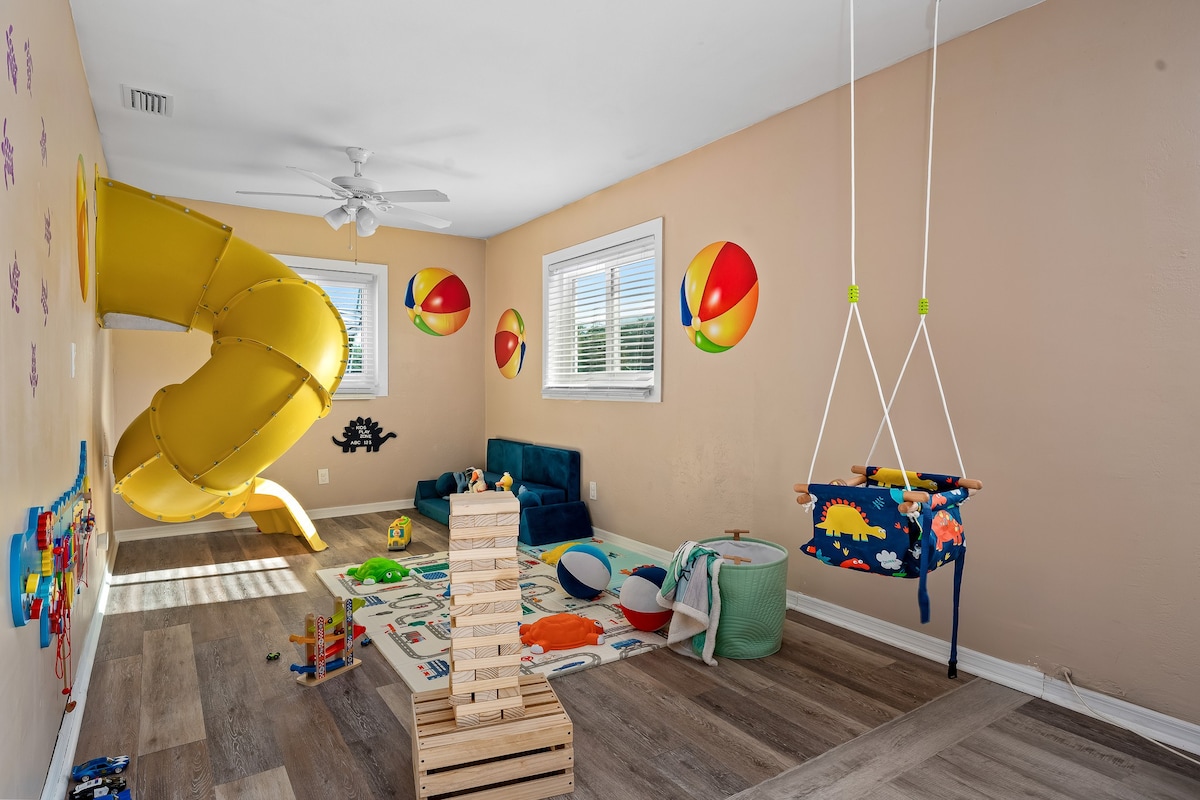 Just 5 minutes from the beach, this stunning family-friendly home offers a safe and exciting retreat. Enjoy a beautiful gated heated pool, life-size games, and a cozy fire pit for evening relaxation. Inside, find a children’s paradise with a slide-packed playroom, a game room, and a Peloton bike for active adults. Each bedroom is beautifully designed, providing the perfect space for families to unwind and create unforgettable memories. The ideal spot for a worry-free, fun-filled getaway!