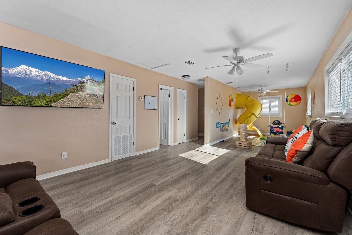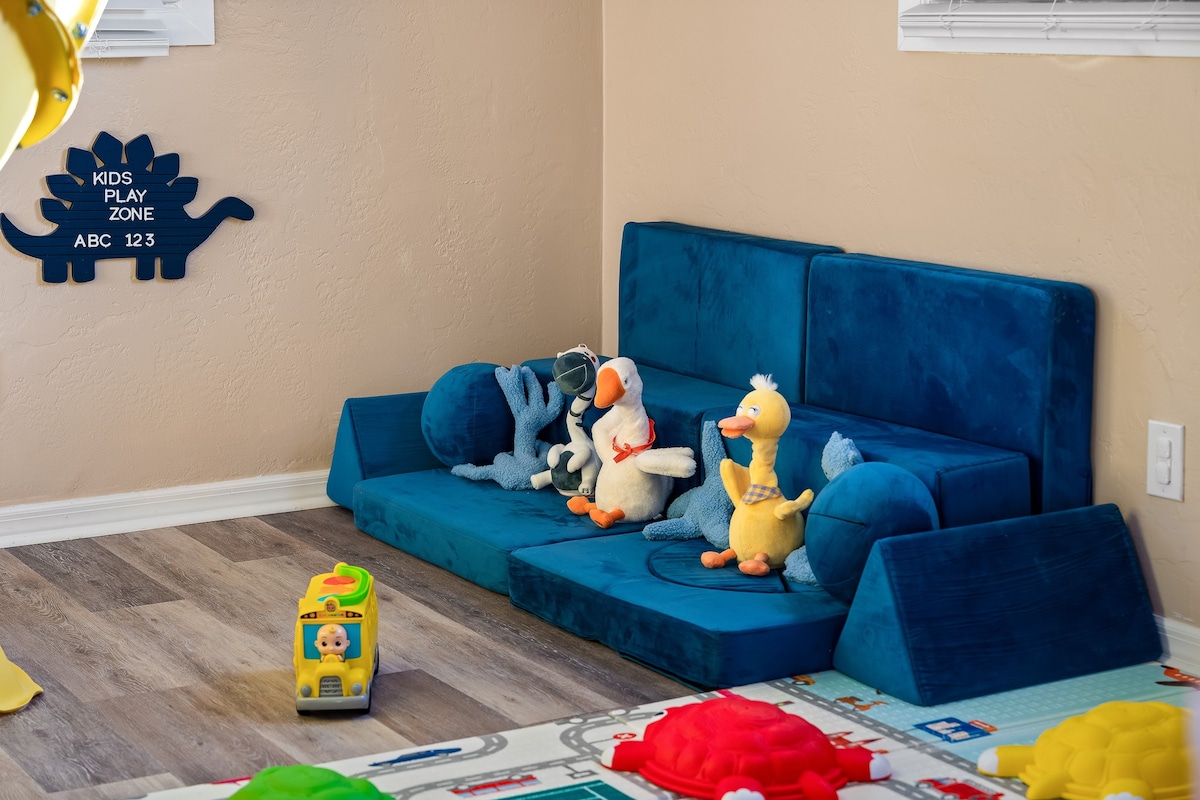 • Living Room: Relax on a comfy sectional recliner sofa while watching TV, or engage in playful interactions in the adjoining kids' playroom, complete with a slide and a variety of toys.
