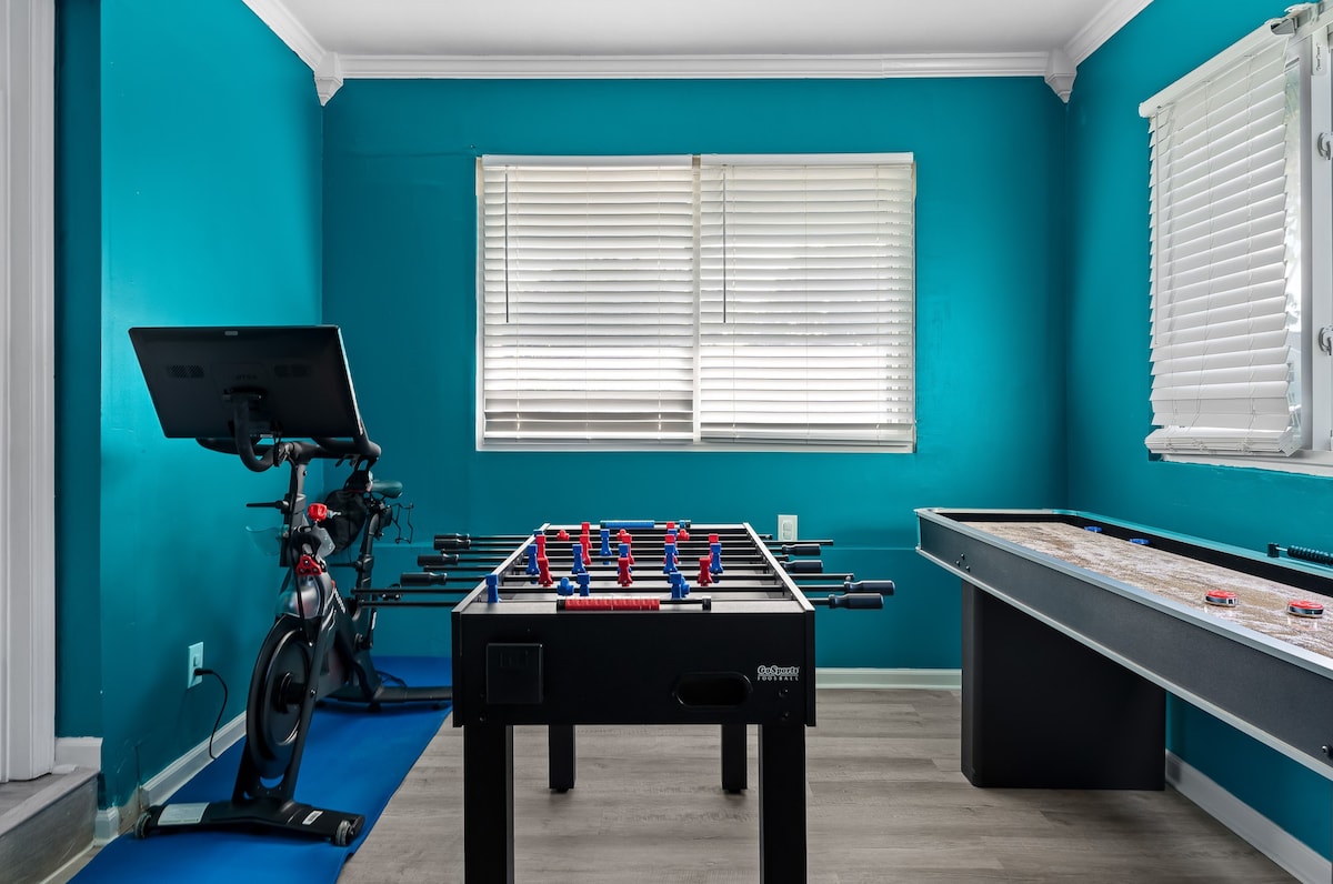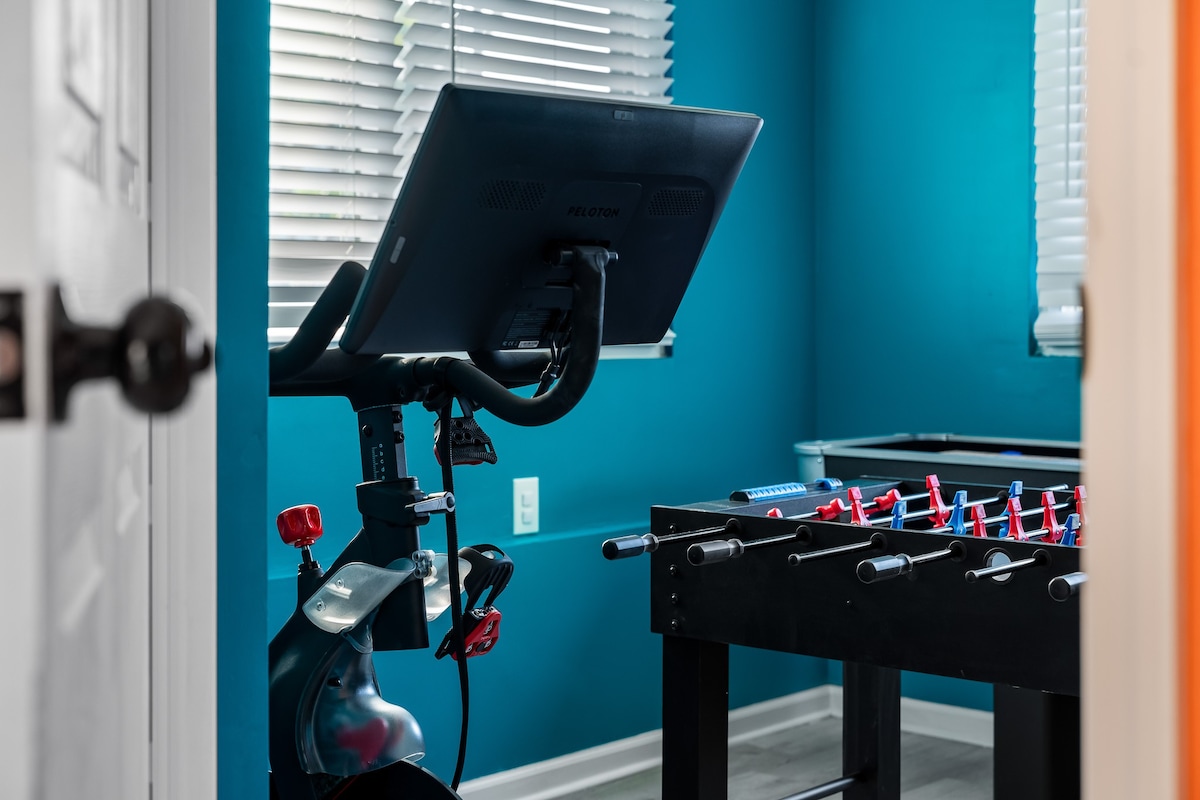 • Game Room: Compete in games of pool, shuffleboard, and foosball. This room also features a TV, magnetic dart board, board games, a Peloton bike, yoga mats, and neoprene dumbbells for fitness and fun.